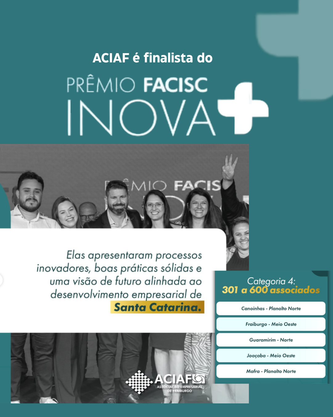 A Associação Empresarial de Fraiburgo – ACIAF celebra mais um importante marco em sua trajetória de excelência e gestão. A entidade está entre as finalistas do prestigiado Prêmio FACISC INOVA+ na Categoria 4: 301 a 600 associados, conforme anunciado recentemente pela Federação das Associações Empresariais de Santa Catarina (FACISC). A ACIAF, representando a região do